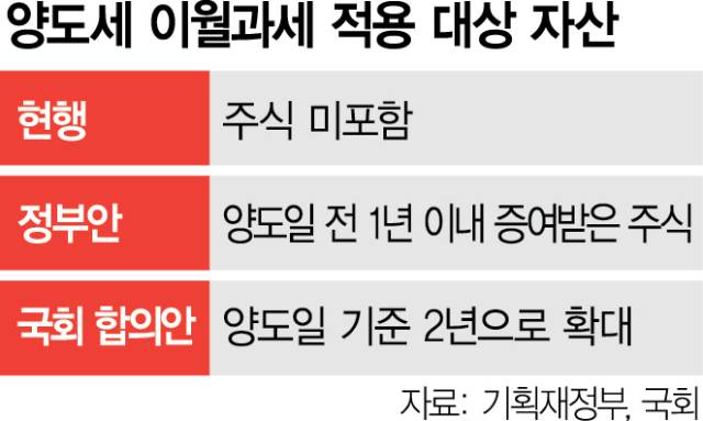 정부가 7월 세법개정안에 양도세 이월 과세 대상에 주식을 포함했고 이번에 국회 논의 과정에서 기간이 늘어난 것은 이 때문이다. 기재부의 한 고위 관계자는 “논의 과정에서 1년이 (조세 회피 방지라는 정책 효과를 담보하기에는) 충분하지 않다는 지적에 정부 역시 충분하다고 답하기는 어려운 측면이 있었다”며 “2년이 적당해 보인다”고 말했다.