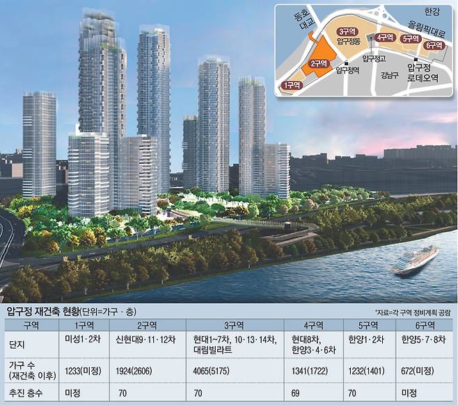 ‘압구정 구현대’로 불리는 서울 강남구 압구정3구역의 경우 최고 70층, 5175가구로 재건축을 추진중이다. 지난 6월과 9월 주민공람을 진행한 압구정2·4·5구역에 이어 마지막으로 주민공람을 진행중이다. 조합이 제출한 계획안에 따르면 압구정3구역은 최고 70층(291m), 5175가구(공공임대 650가구)로 재건축을 추진한다. 사업 진행이 가장 더딘 압구정1구역(미성 1·2차 아파트)은 통합 재건축을 논의할 조짐이다. 두 단지는 지구단위계획으로 묶여 있어 분리 재건축은 쉽지 않아 주민 간 합의가 필요한 상황이다.