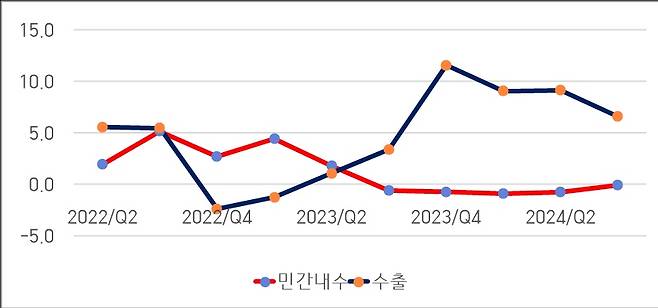 | ▲ 민간 내수 및 수출 증가율(전년동기대비, 실질, %) |