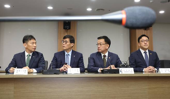 | ▲ 최상목 경제부총리 겸 기획재정부 장관을 비롯한 금융수장들이 8일 서울 영등포구 한국수출입은행에서 열린 거시경제금융회의에 참석해 대화를 나누고 있다. 왼쪽부터 이복현 금융감독원장, 이창용 한국은행 총재, 최 부총리, 김병환 금융위원장. 2024.11.8 |
