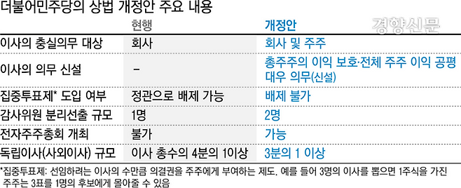 민주당 안은 이사의 충실의무 대상을 ‘회사’에서 ‘회사와 주주’로 확대하고, 이사에게 총주주 이익 보호와 전체 주주 공평 대우 의무를 부과하는 내용을 담고 있다. 대규모 상장회사는 감사위원을 2명 이상 분리 선출해야 하고, 이사 선임 과정에서 정관으로 집중투표제를 배제하지 못하도록 하는 내용도 있다. 집중투표제란 이사 선임시 선임하려는 이사의 수만큼 의결권을 주주에게 부여하는 제도다. 예를 들어 이사를 3명 뽑으면 1주를 보유한 주주는 세 표를 한 후보에게 몰아줄 수 있다.
