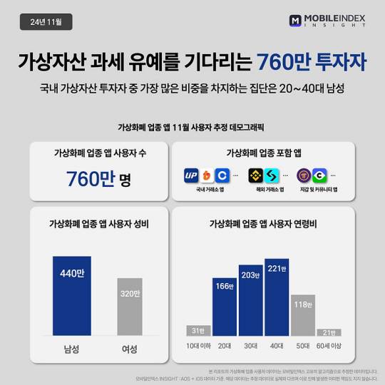 26일 데이터플랫폼 기업 ‘아이지에이웍스’가 자사의 데이터 분석 솔루션을 활용해 분석한 ‘가상화폐 거래소 앱 트렌드’ 보고서에 따르면 국내 가상자산 관련 앱 사용자는 760만명으로 추정됐다. 여기서 관련 앱은 업비트나 빗썸 등 국내 거래소 앱이나 바이낸스 같은 해외 거래소 앱, 코인니스 등 가상자산 커뮤니티 앱처럼 가상자산 투자자들이 사용할 법한 앱을 말한다. 안도걸 더불어민주당 의원이 지난 9월 금융감독원으로부터 제출받은 가상자산 보유 현황(2023년 말)에 따르면 업비트·빗썸에서 실제 투자가 이뤄지는 활성화 계좌는 770만개로 앱 추정 사용자 수와 비슷했다.