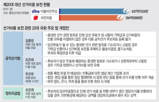 지난 15일 조은희 의원도 ‘이재명 선거비용 434억 먹튀(먹고 도망치는 것) 방지 2법’(공직선거법·정치자금법 개정안)을 대표 발의했다. 해당 개정안은 정당이 선거 비용을 반환하지 않을 경우 경상보조금에서 이를 회수 또는 감액해 지급하도록 하고, 당선무효에 해당하는 중대한 범죄로 기소되거나 선관위로부터 고발된 경우 기탁금 반환이나 선거비용 보전을 유예하도록 했다. 당 지도부는 조 의원의 법안을 당론으로 추진한다는 입장이다. 추경호 원내대표는 지난 19일 원내대책회의에서 “선거 사범들이 국민 혈세를 반납하지 않는 행태를 근본적으로 개선하겠다”며 “기탁금 및 선거보전비용 반환의 실효성 확보를 위한 법적 수단을 마련하겠다”고 말했다.