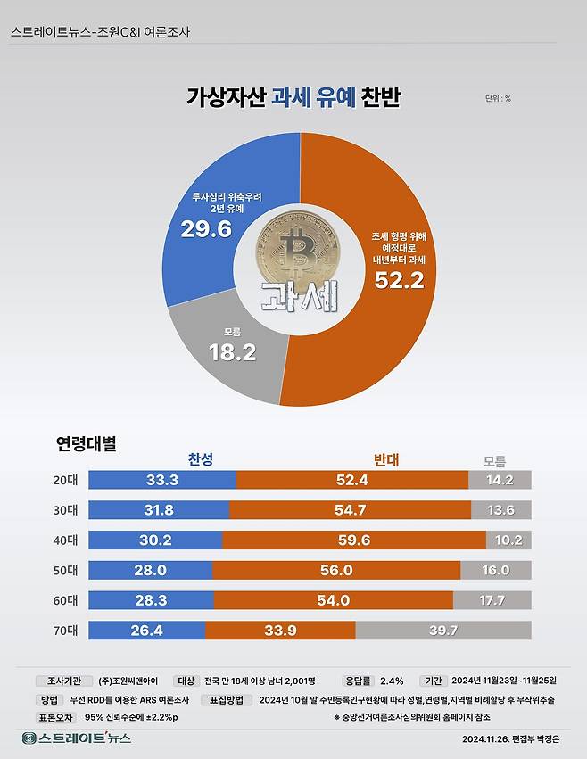27일 조원씨앤아이가 스트레이트뉴스 의뢰를 받아 지난 23~25일 전국 성인 남녀 2001명을 대상으로 실시한 가상자산 과세유예 찬반 여론조사에 따르면 '투자 심리 위축 우려에 따라 2년 유예'를 선택한 비율은 28.6%로 집계됐다.