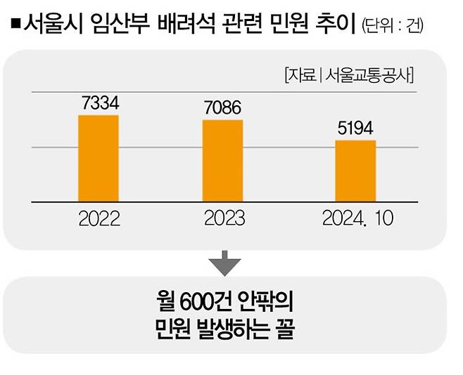 그래서인지 관련 민원이 끊이지 않는다. 서울 지하철 1~8호선을 운영하는 서울교통공사에 접수된 임산부 배려석 관련 민원은 2022년 7334건, 2023년 7086건 등으로 연평균 7000건을 유지하고 있다. 월 민원이 600건 안팎인 셈이다. 올해 들어서도 10월까지 5194건이 접수됐다. 서울교통공사 측이 핑크색 객실의자를 칸당 2석씩 만들고 시인성視認性(모양이나 색이 눈에 쉽게 띄는 성질)을 강화하기 위해 엠블럼과 바닥표지까지 부착했지만 별 효용이 없었다는 거다.