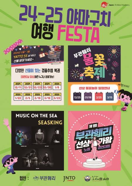 2024년 12월부터 내년 3월까지 열리는 '24-25 야마구치 여행 FESTA'도 기대를 더한다. 부관훼리를 통해 야마구치를 찾는 여행객들에게 특별한 즐거움을 선사한다. 즉석 경품 추첨 이벤트, 선상 노래자랑, 버스킹 공연 등 다양한 프로그램이 승객들에게 즐거움을 안겨주고, 일본 소도시의 매력을 만끽할 수 있는 기회를 제공한다. 부관훼리 측은 "야마구치 소도시 여행은 단순한 여행 이상의 가치가 있다. 야마구치현과 시모노세키의 매력적인 관광지와 맛집, 온천을 탐험하며, 일본의 전통과 자연을 오감으로 느끼는 특별한 시간들은 대도시와는 다른 또 다른 매력을 선물할 것"이라고 강조했다.