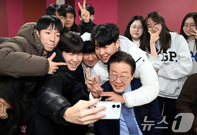 (서울=뉴스1) 김민지 기자 = 이재명 더불어민주당 대표가 27일 서울 성동구 금호고등학교에서 열린 고교 무상교육을 위한 현장 간담회를 마치고 급식을 먹던 도중 학생들과 사진을 찍고 있다. (공동취재) 2024.11.27/뉴스1