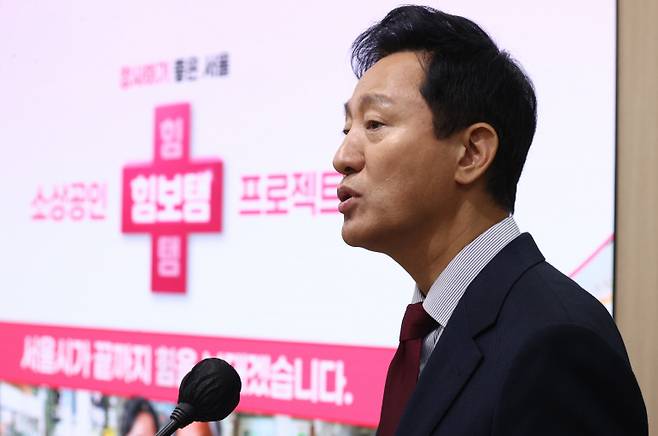 [오세훈 서울시장이 26일 오전 서울시청 브리핑룸에서 소상공인 힘보탬 프로젝트 기자설명회를 하고 있다. (사진=연합뉴스)]