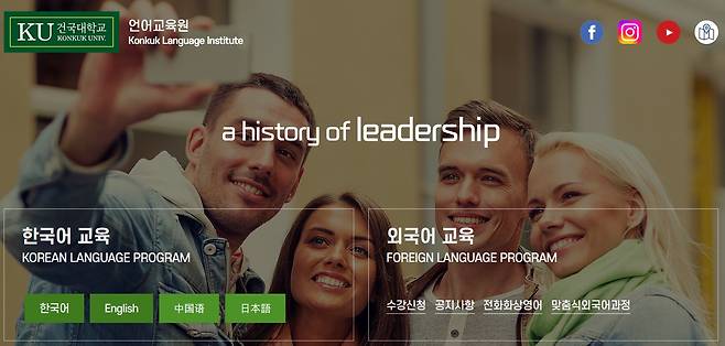 | ▲ 건국대학교 언어교육원 홈페이지 사진. 건국대학교 한국어강사노조에 따르면, 학교 측은 최근 출범한 노조에 속한 강사들에게 강의 시간을 일방적으로 줄이는 등 불이익을 줬다. |