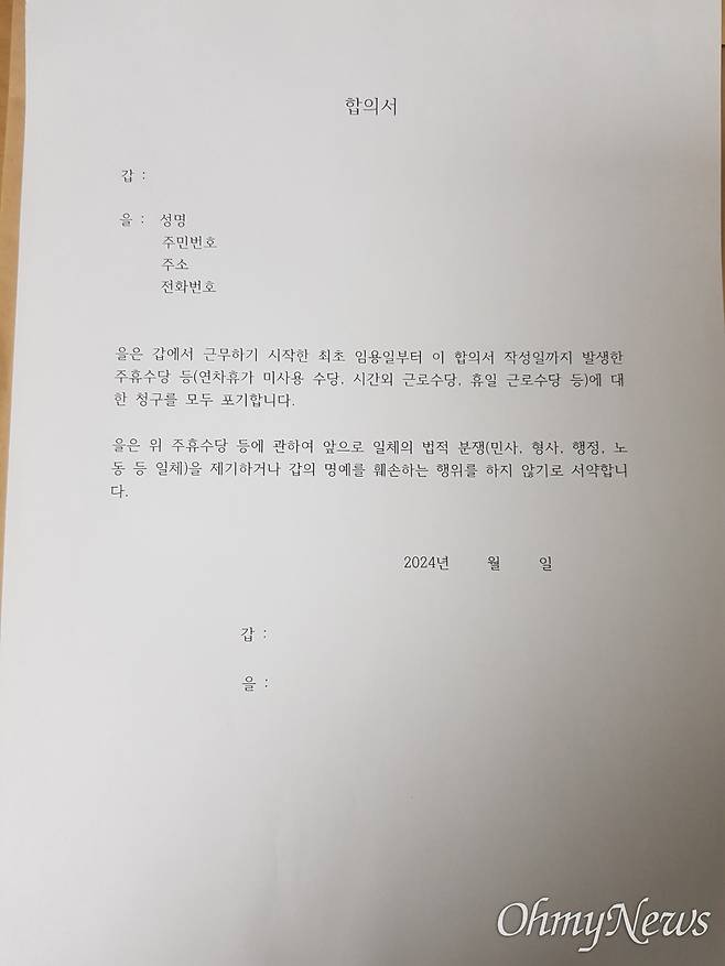 | ▲ 건국대학교 한국어강사 노조에 따르면, 건국대 측은 한국어강사들에게 지금까지 미지급된 주휴수당과 연차수당, 휴일근로수당 등을 모두 포기하겠다는 내용의 합의서를 요구했다. 노조가 제시한 해당 합의서. |