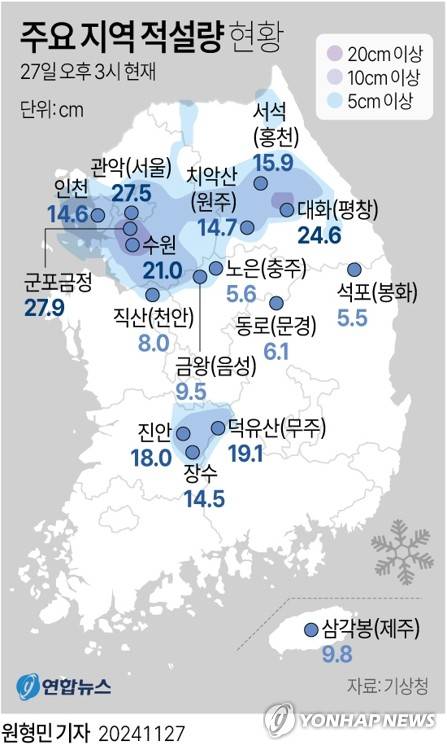 (서울=연합뉴스) 원형민 기자 = 27일 일부 지역에 최대 20㎝가 넘는 폭설이 내리며 곳곳에서 크고 작은 피해가 잇달았다.