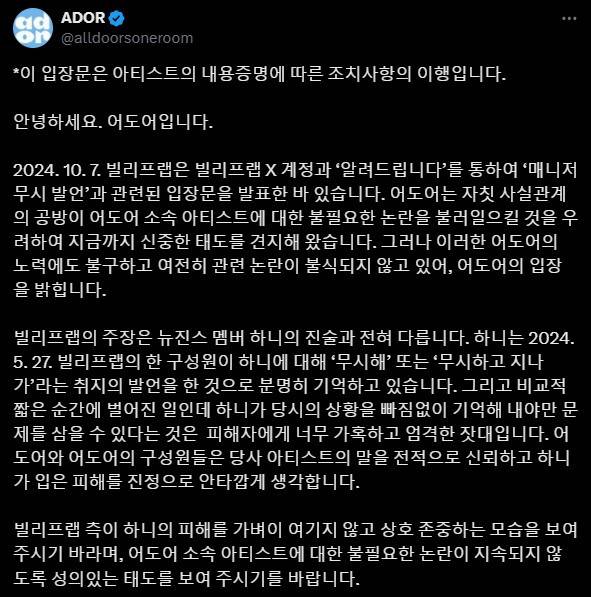 다음은 어도어 입장문 전문 -- ADOR @alldoorsoneroom *이 입장문은 아티스트의 내용증명에 따른 조치사항의 이행입니다.