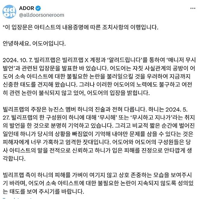 어도어는 27일 X(구 트위터)에 ‘이 입장문은 아티스트의 내용증명에 따른 조치사항의 이행’ 이라는 제목의 글을 올렸다.