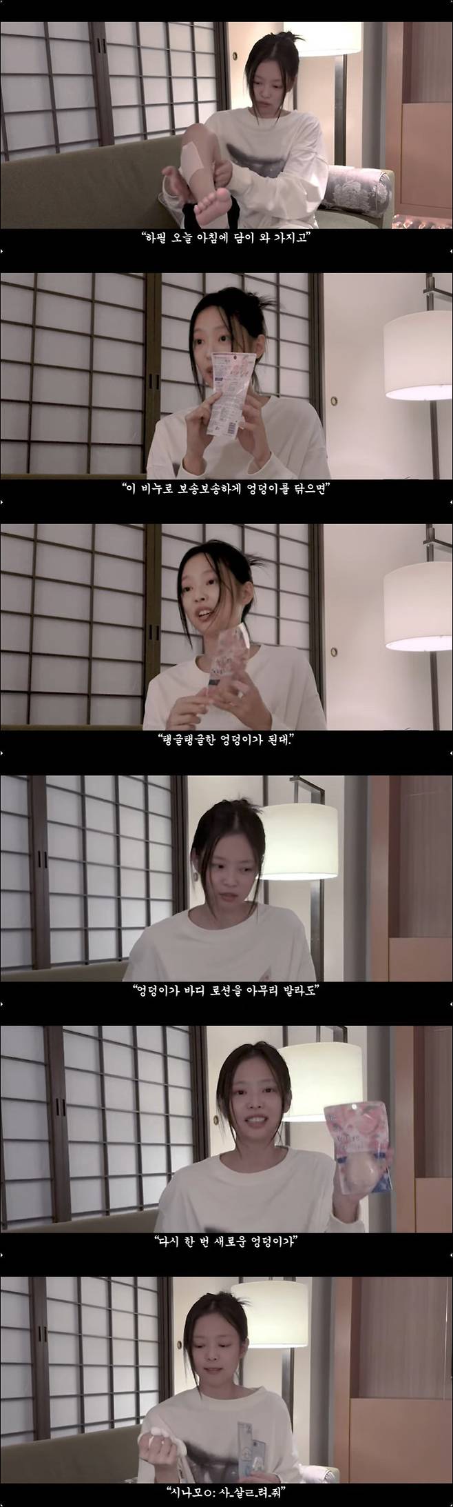 비누를 꺼낸 제니는 "그림을 보면 못 알아듣겠지만 이 비누로 보송보송하게 엉덩이를 닦으면 탱글탱글한 엉덩이가 된다더라. 솔직히 궁금하지 않냐"며 "엉덩이는 바디로션을 아무리 발라도 엉덩이 피부는 도톰해서 관리를 해줘야 한다. 다시 한 번 새로운 엉덩이가"라고 소개했다.