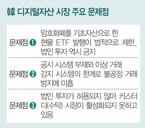 비판 여론이 커지자 금융당국은 뒤늦은 논의에 착수했다. 김소영 금융위 부위원장은 “법인에 대한 실명 계좌 발급 이슈를 시작으로 관련 규제를 폭넓게 논의하겠다”고 밝혔다. 이제야 현물 ETF 출시를 위한 첫발을 뗀 셈이다. 한 자산운용사 관계자는 “법인 투자를 허용해도 현물 ETF 출시 등에 어떤 태도를 취할지 알 수 없다”며 “현재는 암호화폐 관련 기업 ETF를 내놓는 것도 어려운 상황”이라고 토로했다.