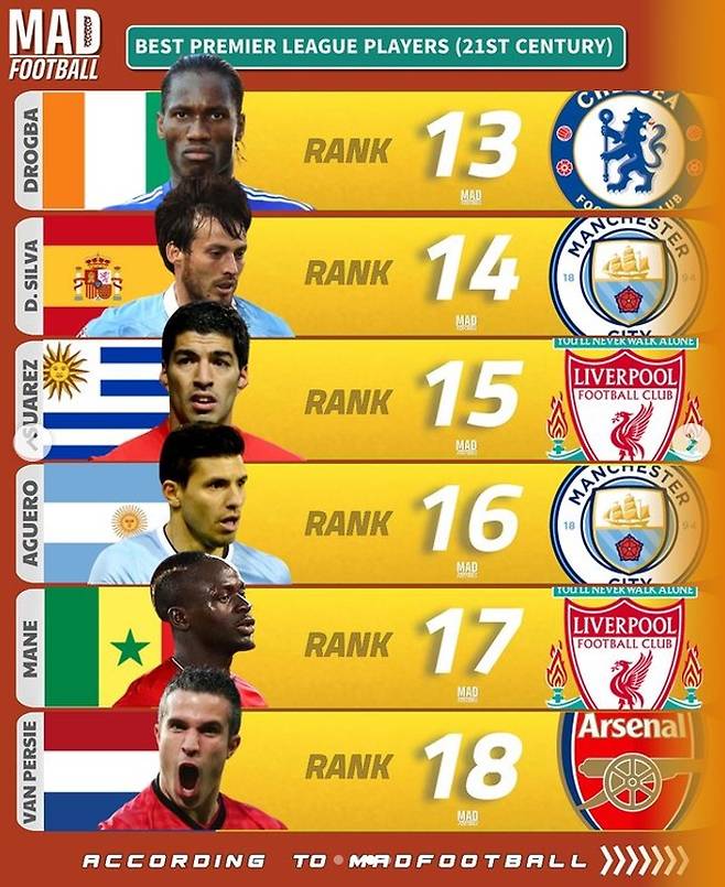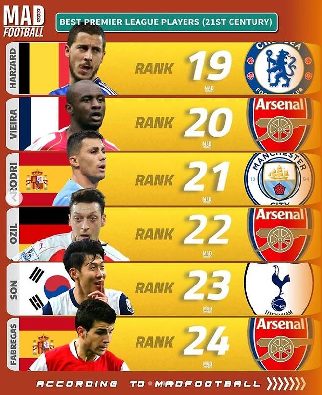 글로벌 매체 '매드풋볼'은 26일(한국시간) 사회관계망서비스(SNS)를 통해 "21세기 프리미어리그 최고의 선수들 TOP 24"를 발표했다.