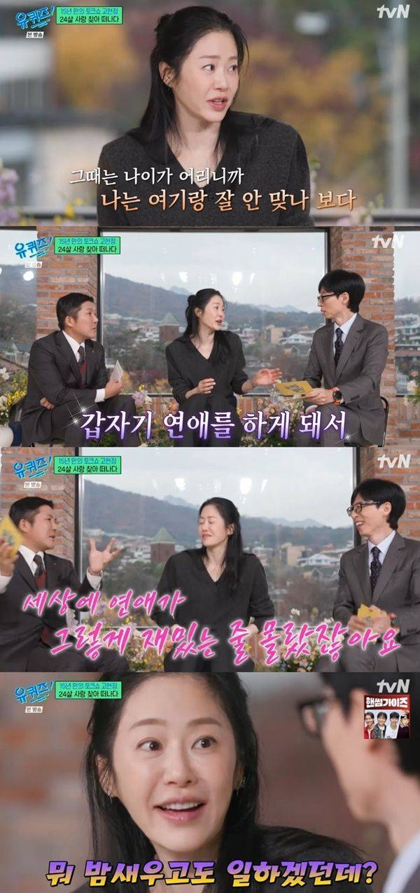 고현정은 "나이가 어리니까 연예계와 잘 안 맞나보다 했다. 하지만 인생이 뜻한 대로 되지 않더라"며 "갑자기 연애를 하게 됐다. 세상에, 연애가 그렇게 재밌는 줄 몰랐다. 올인했다"며 회상했다.