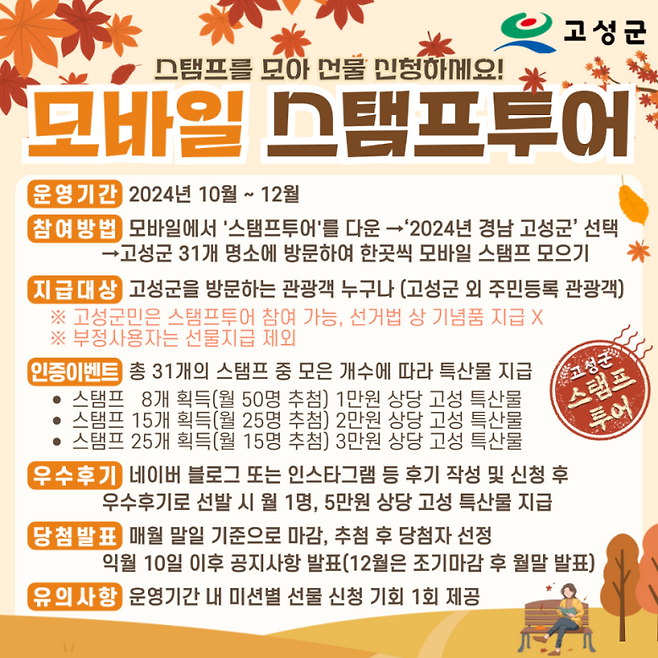 고성군은 관광객들을 대상으로 10월부터 12월까지 진행되는 모바일 스탬프투어 행사를 공개했다. 이번 행사는 방문객들이 고성군의 다양한 명소를 탐험하며 지역 특산물도 받을 수 있도록 기획됐다.