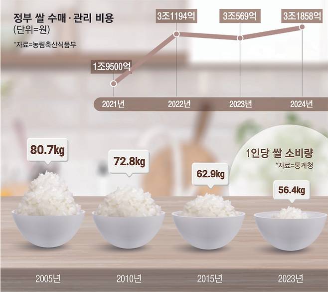 통계청에 따르면 지난해 1인당 연간 쌀 소비량은 56.4kg으로 제도 도입 당시인 2005년 80.7kg에 비해 30.1% 감소했다. 소비량은 급감하고 있으나 공공비축량은 조정되지 않고 있다.