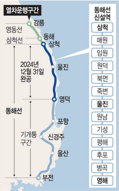 올 한 해의 마지막 날인 12월 31일에 ‘동해선’ 열차가 개통한다. 국토교통부 고시에 따른 동해선은 강원 삼척에서 부산의 부전역까지 노선을 말한다. 한반도의 등지느러미 같은 동해 해안선을 따라 달리는 철도 노선이다. 그렇다고 동해선 열차가 삼척역에서 부전역까지 다닌다는 건 아니다. 삼척역 북쪽 동해역까지는 기왕에 삼척선 노선이 있고, 동해역에서 더 북쪽 강릉역까지는 영동선 노선이 있어 동해선 열차는 강릉역과 부전역 사이의 긴 구간을 운행하게 된다.