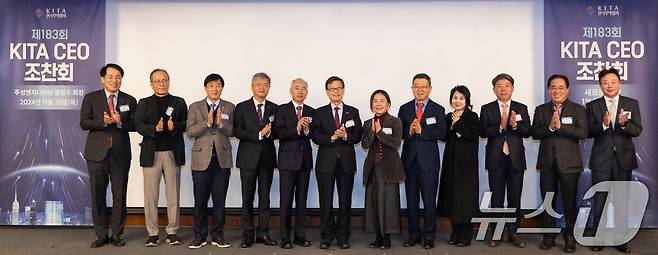 (서울=뉴스1) = 28일 서울 강남구 삼성동 그랜드 인터컨티넨탈 파르나스에서 열린 '제183회 한국무역협회(KITA) CEO 조찬회'에서 이인호 한국무역협회 부회장(왼쪾 네 번째부터), 황철주 주성엔지니어링 회장, 윤진식 한국무역협회 회장, 박혜린 옴니시스템 회장, 오석송 메타바이오메드 회장이 기념촬영을 하고 있다. (무협 제공) 2024.11.28/뉴스1