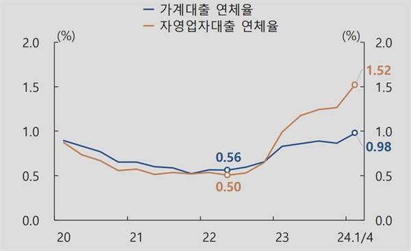 | ▲ 가계대출 / 자영업자 대출 연체율 비교 한국은행 금융안정보고서 (2024.6) |