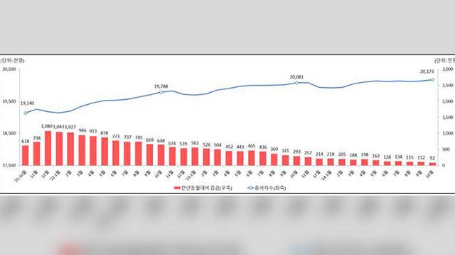 이는 지난해 10월보다 9만 2,000명(0.5%) 늘어난 것으로, 2021년 3월(7만 4,000명 증가) 이후 43개월 만에 가장 작은 증가 폭입니다.