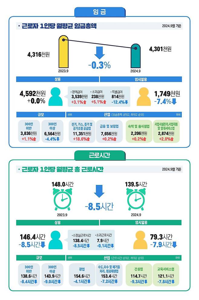 지난 9월 상용근로자 1인당 명목임금은 430만 1000원으로 전년보다 0.3% 줄었다.