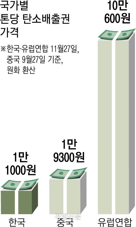 27일 한국거래소에 따르면 이날 국내 탄소배출권은 톤(t)당 1만1100원, 전 세계 최저가 수준에 거래됐다. 전날 유럽연합(EU) 배출권 종가 68.47유로(약 10만600원)의 약 10분의 1에 불과하다. 미국은 물론 중국 역시 지난 9월 톤당 100위안(약 1만9300원)을 넘겼다.