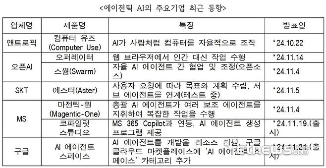 이미 마이크로소프트(MS), 구글, 오픈AI, 엔트로픽, SK텔레콤 등 국내외 거대 정보기술(IT) 기업이 에이전틱 AI의 상용화를 위해 앞다퉈 뛰어들고 있다. 오픈AI는 2025년 초에 '오퍼레이터'라는 코드명의 자율형 AI 에이전트를 출시할 계획이며, 엔트로픽은 이미 웹 서핑, 호텔 예약, 자료 조사, 문서 작성 등에 AI가 스스로 컴퓨터를 사용하여 작업하는 '컴퓨터 유즈'를 공개한 바 있다. MS는 최근 이그나이트 행사에서 기업 환경에서의 생산성 향상과 사용자 맞춤형 지원을 강화하는 AI 에이전트를 선보일 것임을 밝혔다. 또, SK텔레콤은 최근 AI 에이전트 '에스터(Aster)'를 공개하며 글로벌 AI 서비스 시장 진출을 본격화하고 있다.