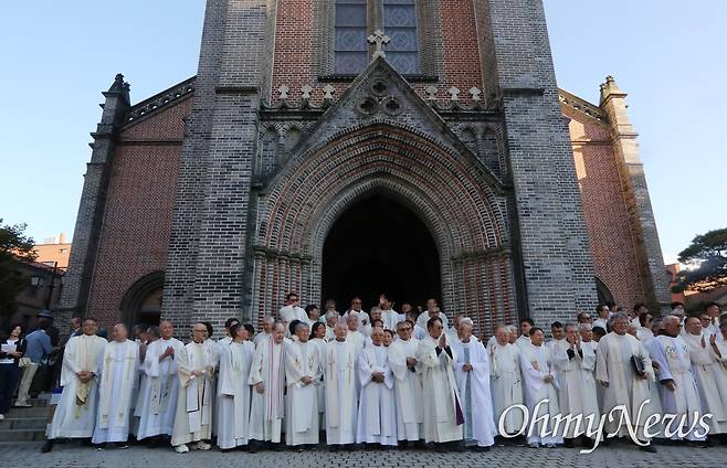 | ▲ 고위 성직자인 주교 5인을 비롯한 천주교 사제 1466명이 "헌법 준수와 국가보위부터 조국의 평화통일과 국민의 복리증진까지 대통령의 사명을 모조리 저버린 책임을 물어 (윤석열 대통령의) 파면을 선고하자"는 내용의 시국선언을 발표했다. 사진은 지난 9월 23일 열린 천주교정의구현전국사제단 창립 50주년 기념미사를 마친 뒤 사제단들이 기념촬영을 하는 장면 |