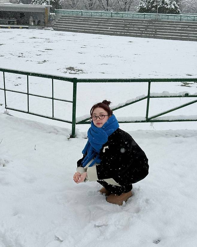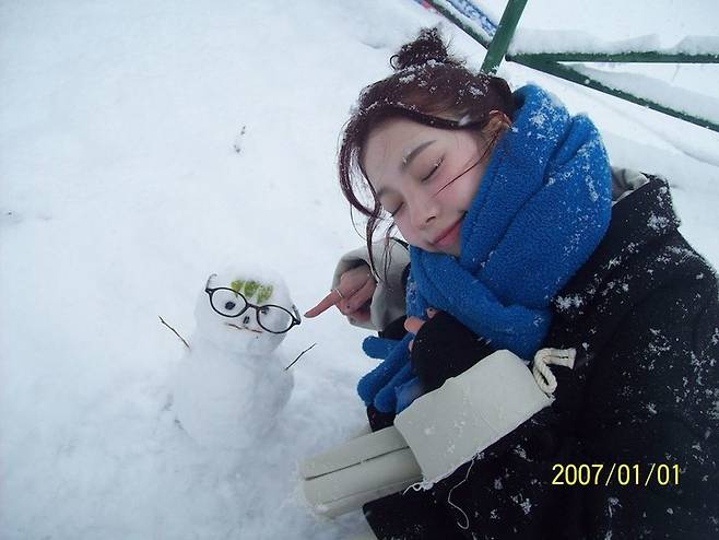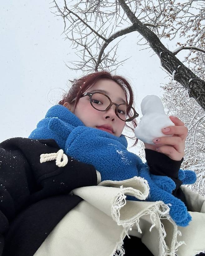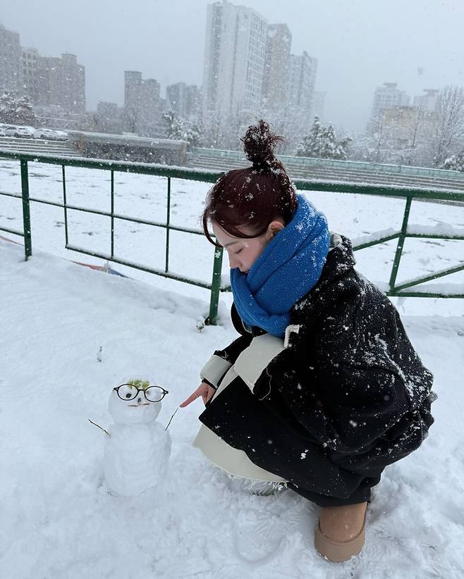 공개된 사진 속에서 카리나는 첫눈이 내린 날 눈사람을 만드는 모습을 보여줬다.