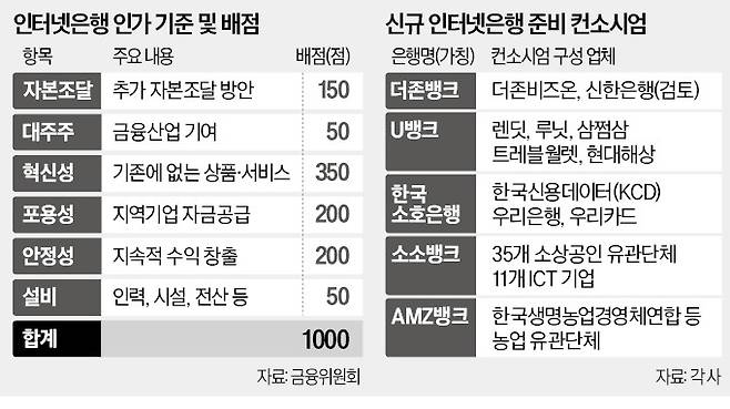 금융위원회는 28일 이런 내용의 인터넷전문은행 신규 인가 심사 기준 및 절차를 발표했다. 인가 평가 항목과 배점은 자금 조달(150점), 대주주(50점), 혁신성(350점), 포용성(200점), 안정성, 인력·설비(50점) 등 총 1000점으로 구성했다.