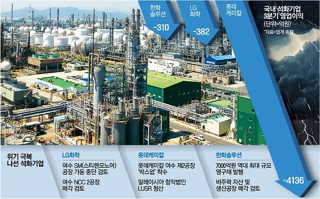 LG화학 역시 여수산단 내 스티렌모노머(SM) 공장 가동중단을 검토중이다. 한화솔루션 역시 재무구조 개선을 위해 7000억대 규모의 영구채를 발행했다.