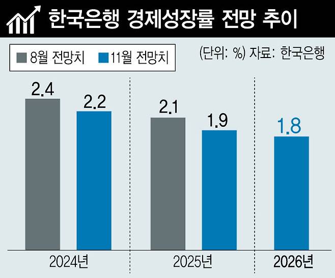 28일 한국은행이 내년과 2026년 각각 1.9%, 1.8% 성장률 전망을 발표한 뒤 대통령실은 "내년도 성장률 하향은 미 신정부의 보호무역 등 정책 변화를 미리 반영한 데 기인한 것으로 보인다"며 "우리 경제에 부정적 영향이 최소화될 수 있도록 만전을 기하는 한편, 구조개혁과 양극화 타개 등 민생경제 회복을 위한 정책 노력을 한층 더 강화해 나갈 것"이라고 밝혔다.
