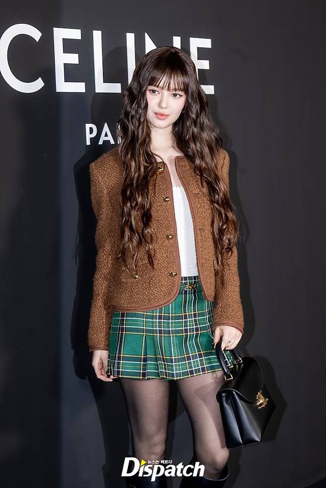 다니엘은 브라운 재킷과 그린 체크 미니스커트로 멋을 냈다. 인형같은 미모가 돋보였다.