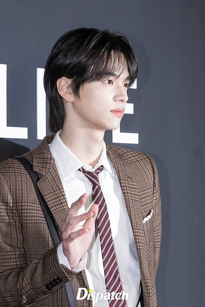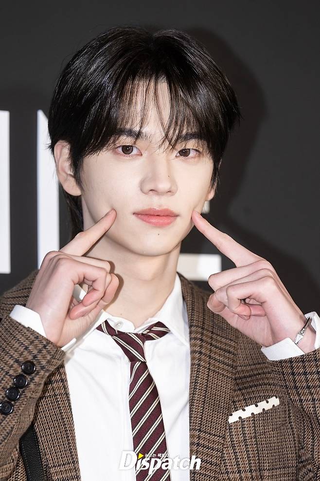 신유는 브라운 체크 재킷과 넥타이로 멋을 냈다. 잘생긴 비주얼이 돋보였다.