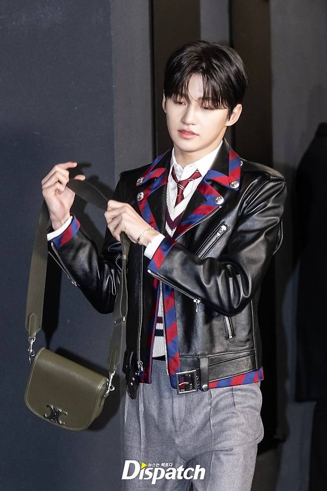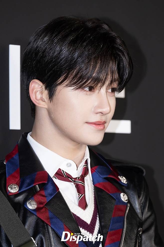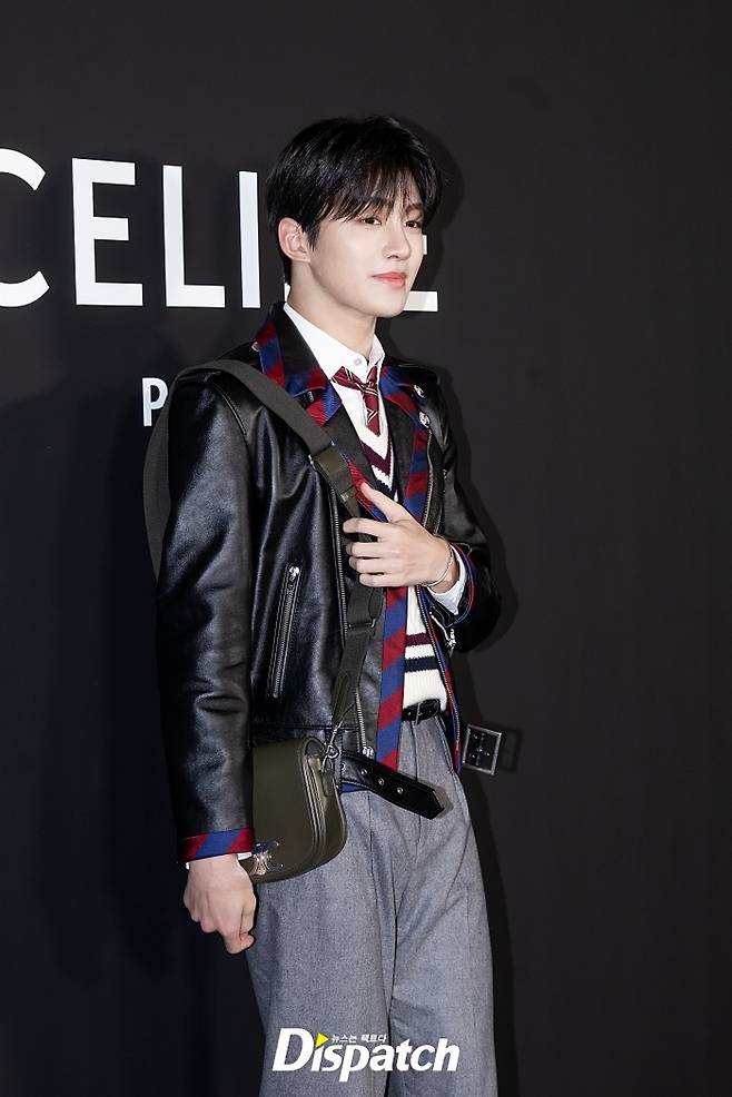 지훈은 프레피룩에 레더 재킷으로 포인트를 줬다. 잘생긴 비주얼이 돋보였다.