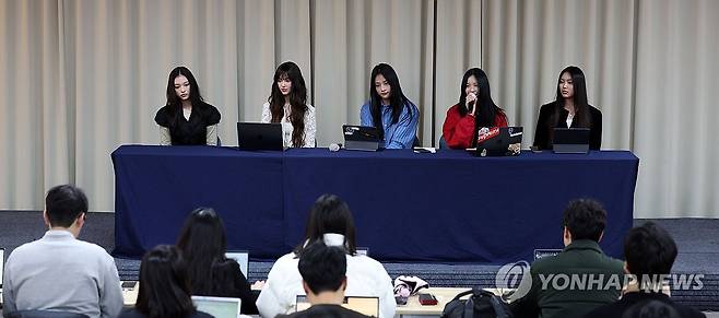 (서울=연합뉴스) 김성민 기자 = 걸그룹 뉴진스가 28일 오후 서울 강남구 스페이스쉐어 삼성역센터에서 열린 전속계약 해지 관련 기자회견에 참석해 있다. 왼쪽부터 해린, 다니엘, 민지, 하니, 혜인. 2024.11.28 [공동취재]