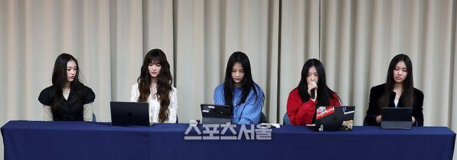 그룹 뉴진스가 28일 서울 강남구 스페이스쉐어 삼성역센터에서 어도어와의 전속계약 해지 관련 긴급 기자회견을 하고 있다. 왼쪽부터 해린, 다니엘, 하니, 민지, 혜인.