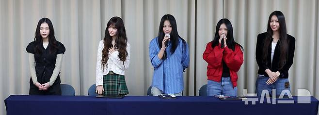 [서울=뉴시스] 김선웅 기자 = 그룹 뉴진스가 28일 서울 강남구 스페이스쉐어 삼성역센터에서 어도어와의 전속계약 해지 관련 긴급 기자회견을 하고 있다. 왼쪽부터 해린, 다니엘, 하니, 민지, 혜인. 2024.11.28. mangusta@newsis.com