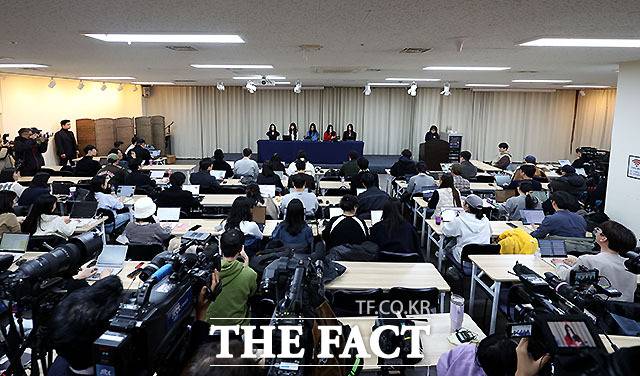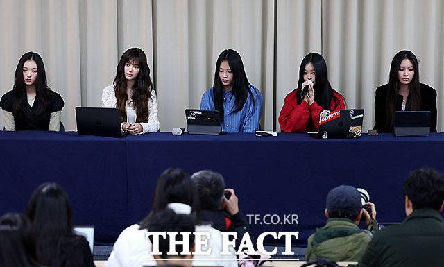 뉴진스는 28일 오후 8시 30분 서울시 강남구 스페이스쉐어 삼성역센터에서 전속계약 해지 관련 긴급 기자회견을 진행했다.