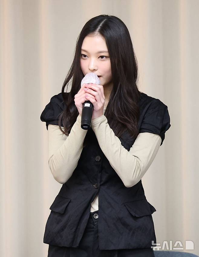 [서울=뉴시스] 김선웅 기자 = 그룹 뉴진스 멤버 해린이 28일 서울 강남구 스페이스쉐어 삼성역센터에서 어도어와의 전속계약 해지 관련 긴급 기자회견을 하고 있다. (공동취재) 2024.11.28. photo@newsis.com