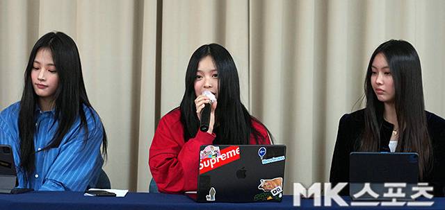 기자회견 갖는 뉴진스 민지, 하니, 혜인.