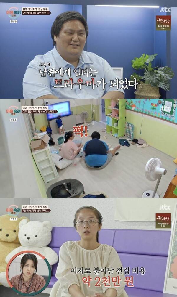 현재 무직인 남편은 "2년 전에 회사 다니다가 다리를 다쳤는데 왜 회사에서 다쳤다고 하냐고 회사와 분쟁이 있었다. 사기꾼이네, 경찰서에 보내겠다고 협박조로 말해서 충격을 많이 받았다"며 당시 트라우마로 스트레스를 받아 살이 찐 것이라고 설명했다.