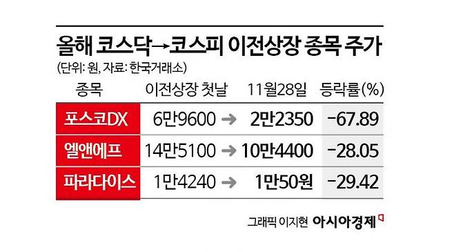 올해 첫날 유가증권시장에 입성한 포스코DX의 주가는 이전상장 이후 67.89%나 하락했다. 이전상장 당시 7만원을 바라보던 주가는 현재 2만원대로 떨어진 상태다. 이어 1월 말 옮긴 엘앤에프의 상황도 다르지 않다. 연초 20만원을 넘어서기도 했던 주가는 현재 10만원대로 반토막이 났다. 이전상장 후 28.05% 하락했다. 6월 유가증권시장에 입성한 파라다이스는 이전상장 후 29.42% 떨어졌다. 1만4000원대였던 주가는 이전상장 후 줄곧 하향곡선을 그렸다. 이달 15일에는 장중 9000원까지 떨어지며 52주 신저가를 기록하기도 했다. 신저가를 기록한 후 반등해 최근 상승세를 이어가고 있지만 1만원대 초반에서 벗어나지 못하는 모습이다.