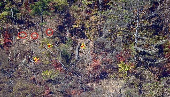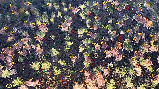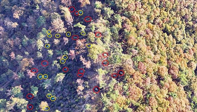 | ▲ 참나무 베어내고 소나무만 남긴 숲가꾸기를 한 숲이다. 반복되는 훈증으로 재선충이 급속히 확산되어 숲이 전멸 중이다. 노랑 동그라미는 수년 전, 검은색 비닐로 덮은 빨강 동그라미는 최근 훈증 한 것들이다. |