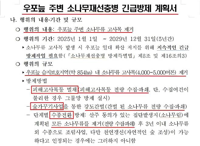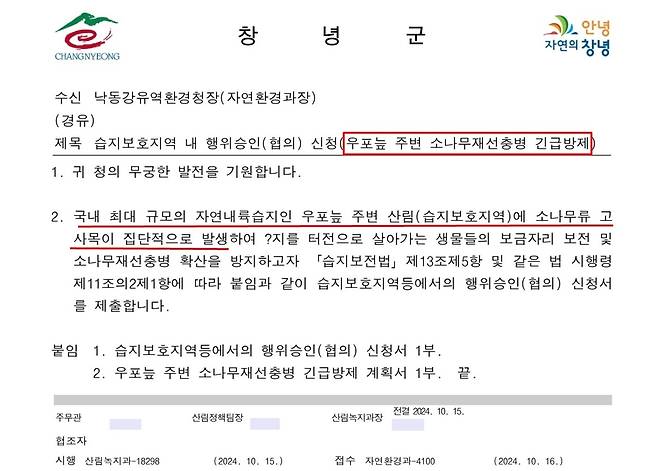 | ▲ 우포늪 주변의 재선충 감염된 소나무를 잘라내겠다고 낙동강유역청장에게 보낸 창녕군 공문 |