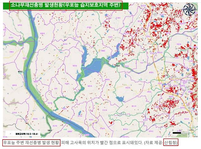 | ▲ 2016~2018년 우포늪 주변의 재선충 현황을 정리한 산림청 자료 |