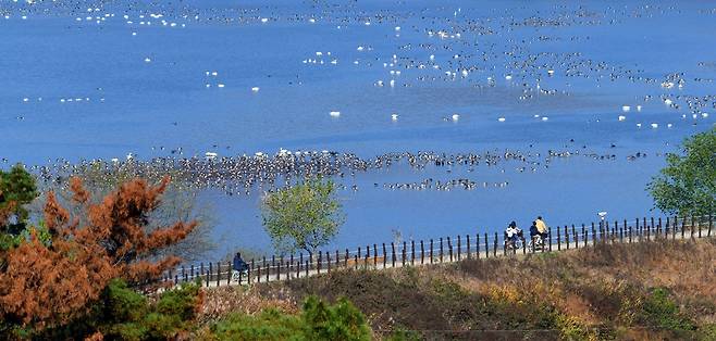 | ▲ 큰고니와 기러기가 찾아온 우포늪에 가족 단위 관광객들도 찾고 있다. |
